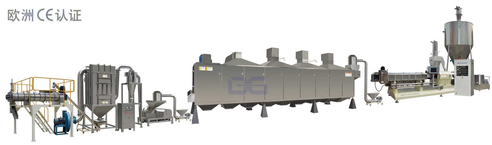 雙螺杆擠壓膨化機生產變性澱粉,是變性澱粉生產的一種新技術。該技術是將輸送混合、加溫加壓、剪切熔融等操作集於一體的雙螺杆擠壓膨化機做反應器,進行澱粉的熱化學變性;是高溫、短時、低水分、高能量的熱化學過程,可把幾個化學反應放在單一的設備中進行,時空產量高;設備配套簡單、占地小、操作方便;雙螺杆擠壓機作為反應器可連續生產氧化、酯化、交聯、醚化等多種類型的變性澱粉,且無汙水產生;雙螺杆擠壓機具有更高的混合效率、過程控製好、產品均一,是快捷、連續生產多種變性澱粉的一種經濟可行的加工方法。