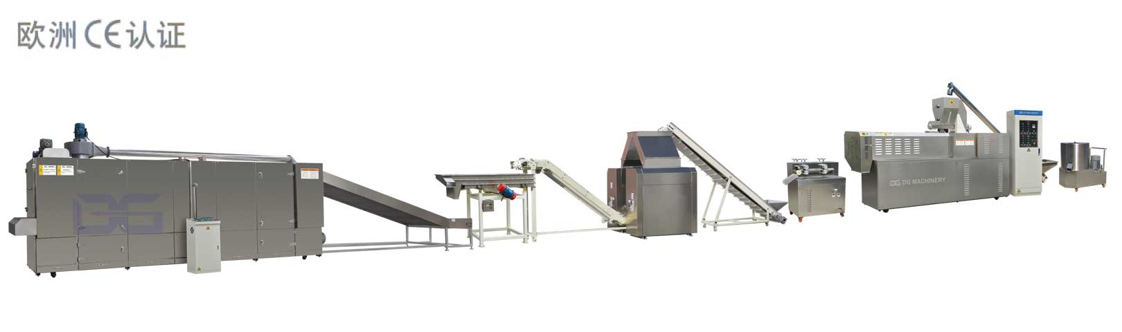 該生產線以麵粉、澱粉為原料,經雙螺杆擠壓膨化機擠出膨化坯料,再打糠、篩選生產針糠、雪花糠,也可擠出旋切生產片狀、球形糠,此擠出法生產改變了傳統麵包糠的生產工藝,原料混合、熟化、打糠、篩糠均流水線生產,生產效率高、無廢料、原料產品多樣,有日式長針狀糠、美式顆粒糠、雪花糠、片狀糠、球形糠等。“麵包糠”是一種廣泛使用的食品添加輔料,用於炸製洋蔥圈、西餐牛排、炸雞腿等。