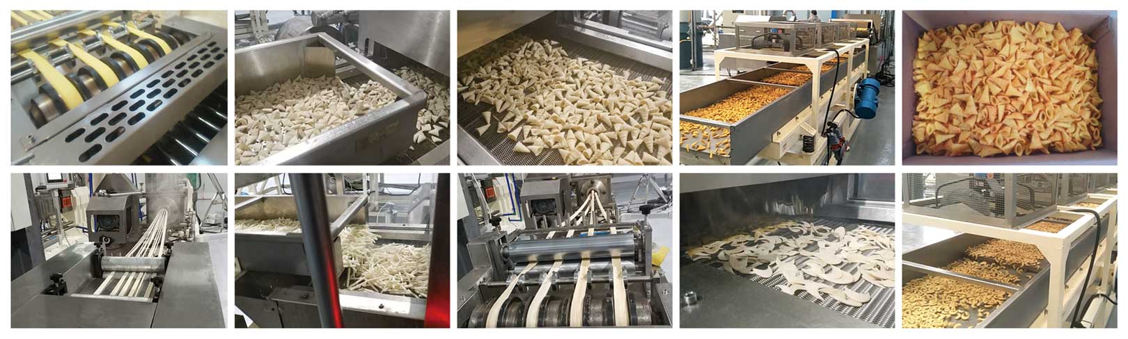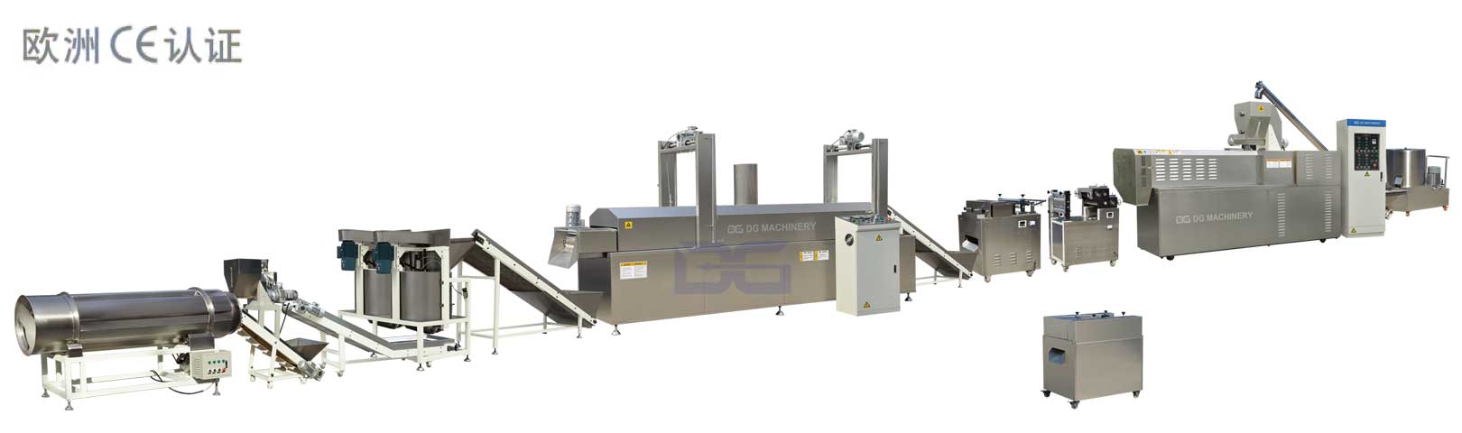 該生產線是傳統手工麵食的機械化生產,不僅保留了手工麵食製品脆而不膩的良好口感,更實現了原料、造型的無限創新;一台雙螺杆擠出機即可完成混合揉練、蒸煮熟化、擠出成型的過程。配套沙拉切斷機、油炸機,可生產沙拉片條、鍋巴等2D油炸麵食產品;配套壓花機、複合成型機、油炸機,可生產妙脆角、枕包、金魚等3D造型的油炸麵食產品。