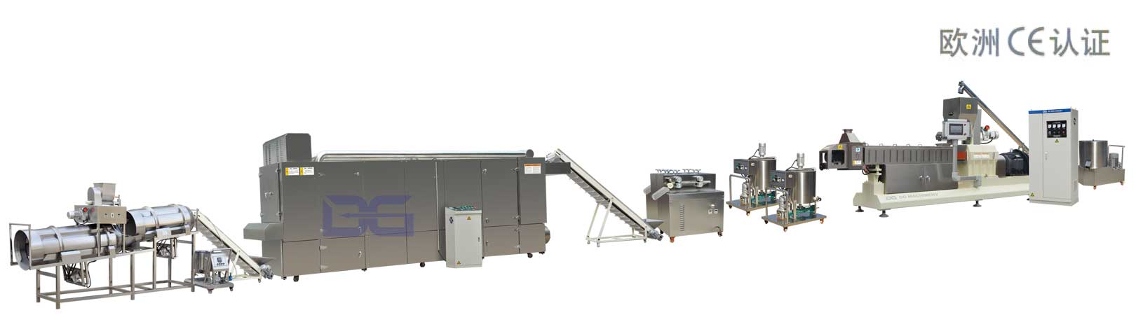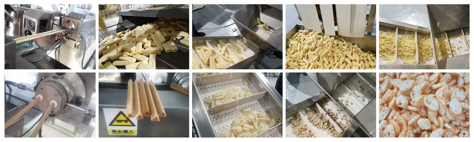 該生產線以玉米粉、大米粉、麵粉等為主要原料,經雙螺杆擠壓膨化機擠出空心卷、餅的同時,注餡機將奶油、巧克力、花生醬等不同口味的餡料注入其中,實現共擠出,從而賦予了膨化食品更豐富的口味;擠出的夾心卷餅即可滾切、也可直切,可敞口、也可封口;喂料、擠壓膨化、注餡、成型、烘烤、噴塗均流水線生產;可變換模具和成型機生產醬油餅及仙貝,還可變換模具生產各種形狀的膨化休閑小食品。