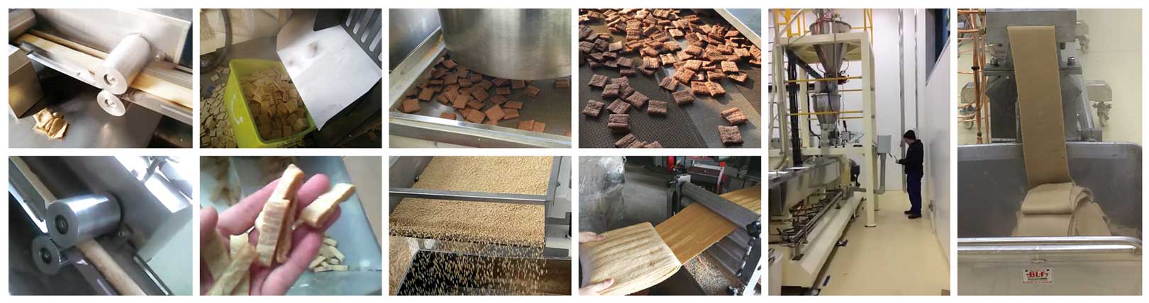 新型雙螺杆擠壓膨化機組織拉絲蛋白是以低溫豆粕、大豆分離蛋白、穀朊粉等為主要原料,在雙螺杆擠壓膨化機內完成物料的強製輸送、混合均質、粉碎捏合、剪切熔融、蒸煮熟化、高溫殺菌、擠出成型等工藝過程,形成層狀韌性纖維結構,從而生產出層狀肌纖維結構、高強度、高韌性的類似肉的質感和口感的大豆拉絲蛋白食品; 根據擠出模具和輔助設備的不同,可分別生產圓柱、塊、片、條、粒、布丁、屑等形狀;這種雙螺杆擠壓機生產的拉絲蛋白食品具有良好的吸水保油特性、隨味性強、耐高溫燉煮,因而可廣泛用於肉製品、快餐食品、速凍食品、餡料、方便麵調料等,也可製成不同風味的素肉休閑食品和素食菜肴。組織拉絲蛋白生產線是一整套全自動生產線,包括原料混合、擠壓成型、烘幹、冷卻等設備,並有不同產量和配置的生產線。