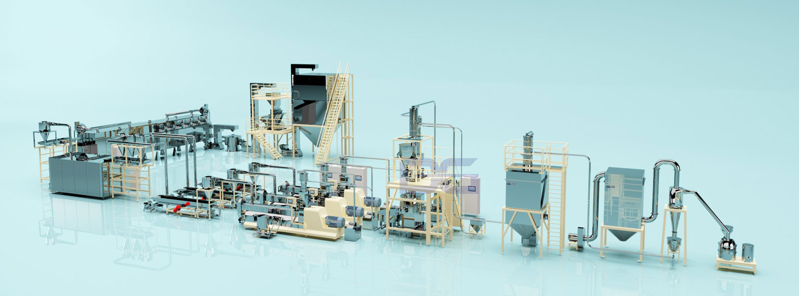 【1】拌粉機【2】螺旋提料機【3】DG75-II【4】振動冷卻機【5】風送機【6】冷卻攤料機【7】五層穿透式烘箱